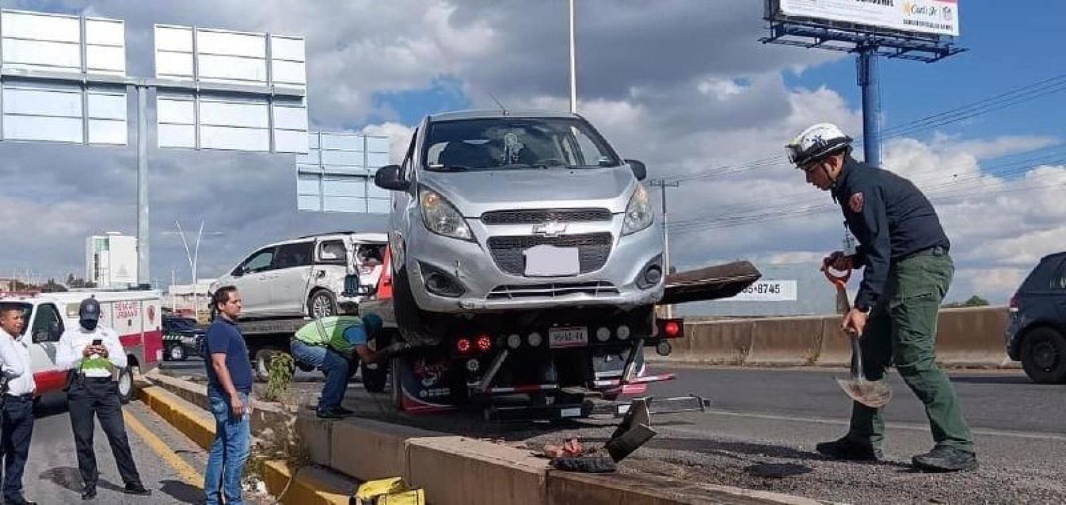 El vehículo siniestrado fue un Chevrolet Spark color gris, que terminó con daños en la parte frontal de la carrocería y estuvo a punto de salirse del camino, incluso la llanta delantera del lado derecho quedó suspendida parcialmente, pues la estructura de acero evitó que el vehículo saliera 'volando'.