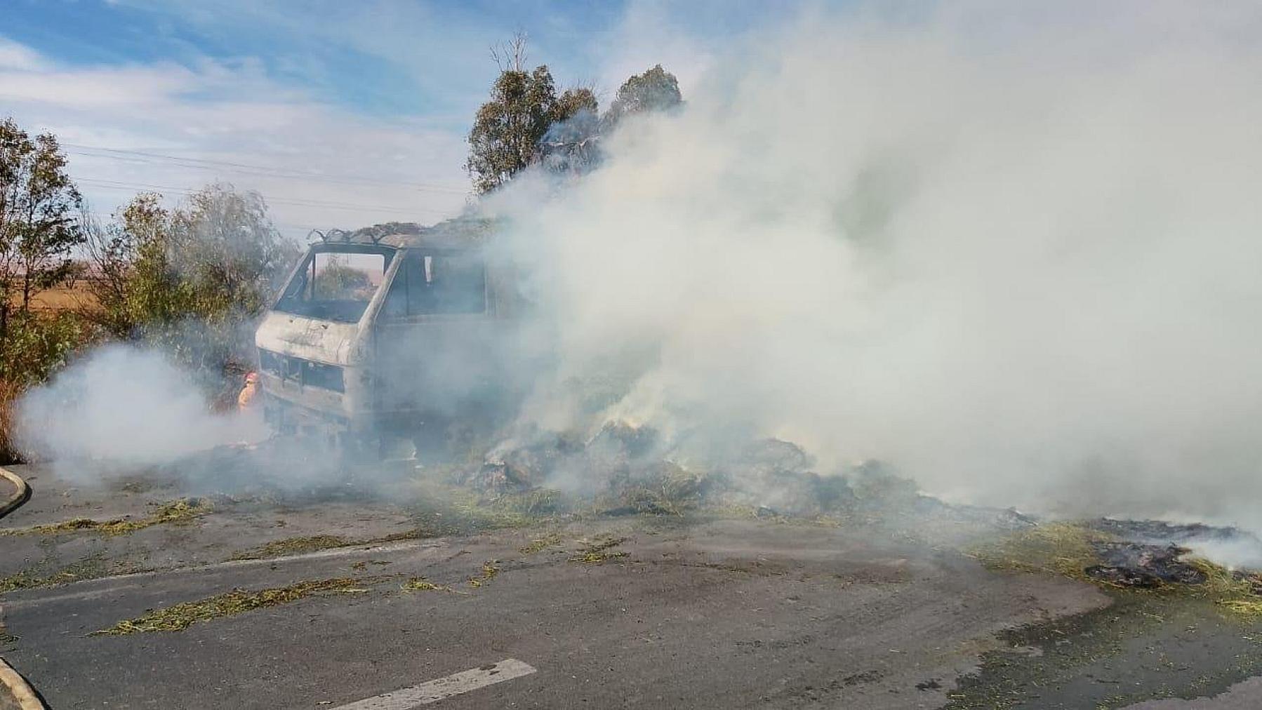 MORELOS, ZAC.- Minutos después del mediodía, un camión de carga que transportaba pastura como alimento para ganado comenzó a incendiarse cuando circulaba por la Carretera Federal 45, tramo Calera-Morelos en dirección a la capital zacatecana.