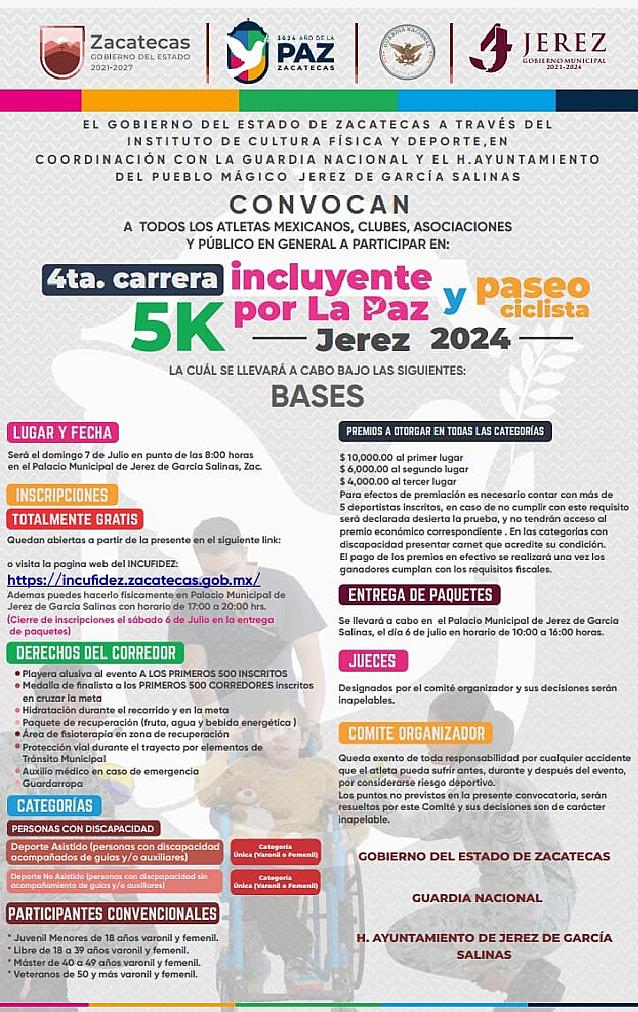 El evento es organizado por el Gobierno de Zacatecas, a través del Instituto de Cultura Física y Deporte (Incufidez), en coordinación con la Guardia Nacional y el Ayuntamiento del Pueblo Mágico de Jerez y convoca a la comunidad atlética y al público en general a participar en esta carrera de cinco kilómetros, en un evento que dará inicio a las 08:00 horas en el exterior del Palacio Municipal.