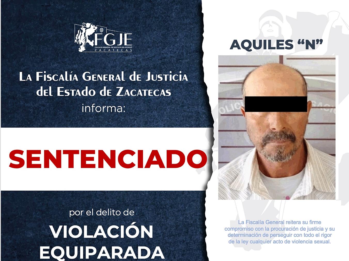 SOMBRERETE, ZAC.- La Fiscalía General de Justicia del Estado obtuvo sentencia condenatoria mediante procedimiento abreviado en contra de Aquiles “N”, por el delito de violación equiparada en perjuicio de una persona con discapacidad intelectual. Se le impuso una pena de seis años y ocho meses de prisión.