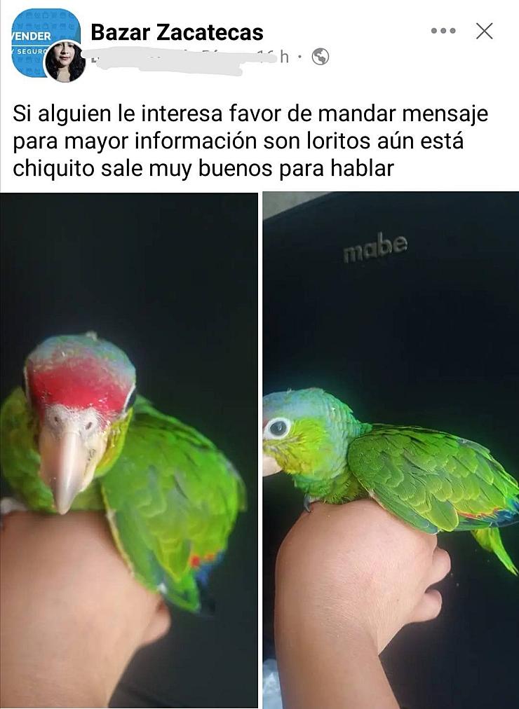 “Si alguien le interesa favor de mandar mensaje para mayor información son loritos aún está chiquito sale muy buenos para habarl (sic”, se lee en uno de los mensajes publicados por una mujer en redes sociales.
