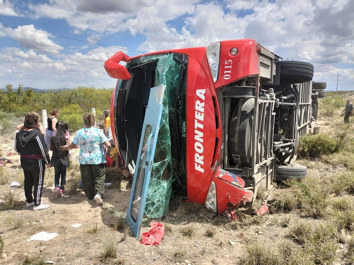 En el lugar se localizó un autobús de pasajeros, marca Inzar, de color rojo, de la línea Frontera, con placas del Servicio Público Federal y número económico 0115 el cual se encontró volcado sobre la carretera.