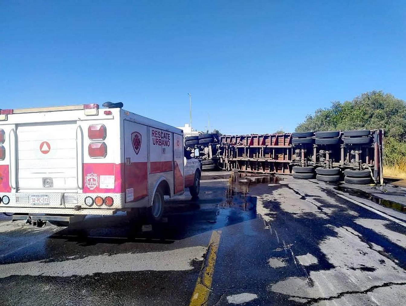 ZACATECAS.- La tarde de este lunes, poco antes de las 15 horas, se registró la volcadura de un tráiler que transportaba garrafones de agua, en la carretera a Fresnillo, a la altura de la comunidad de La Pimienta, en dirección norte